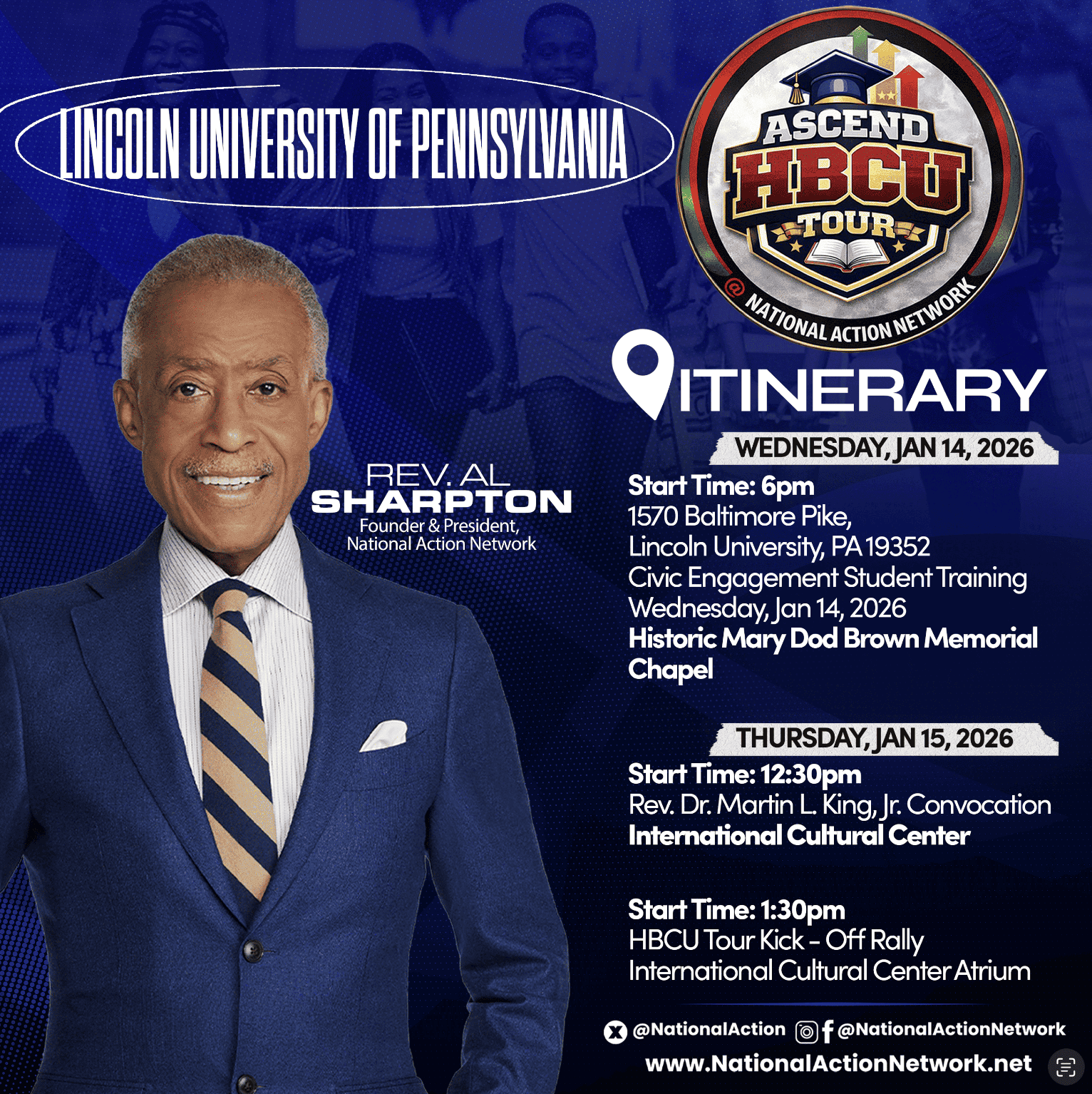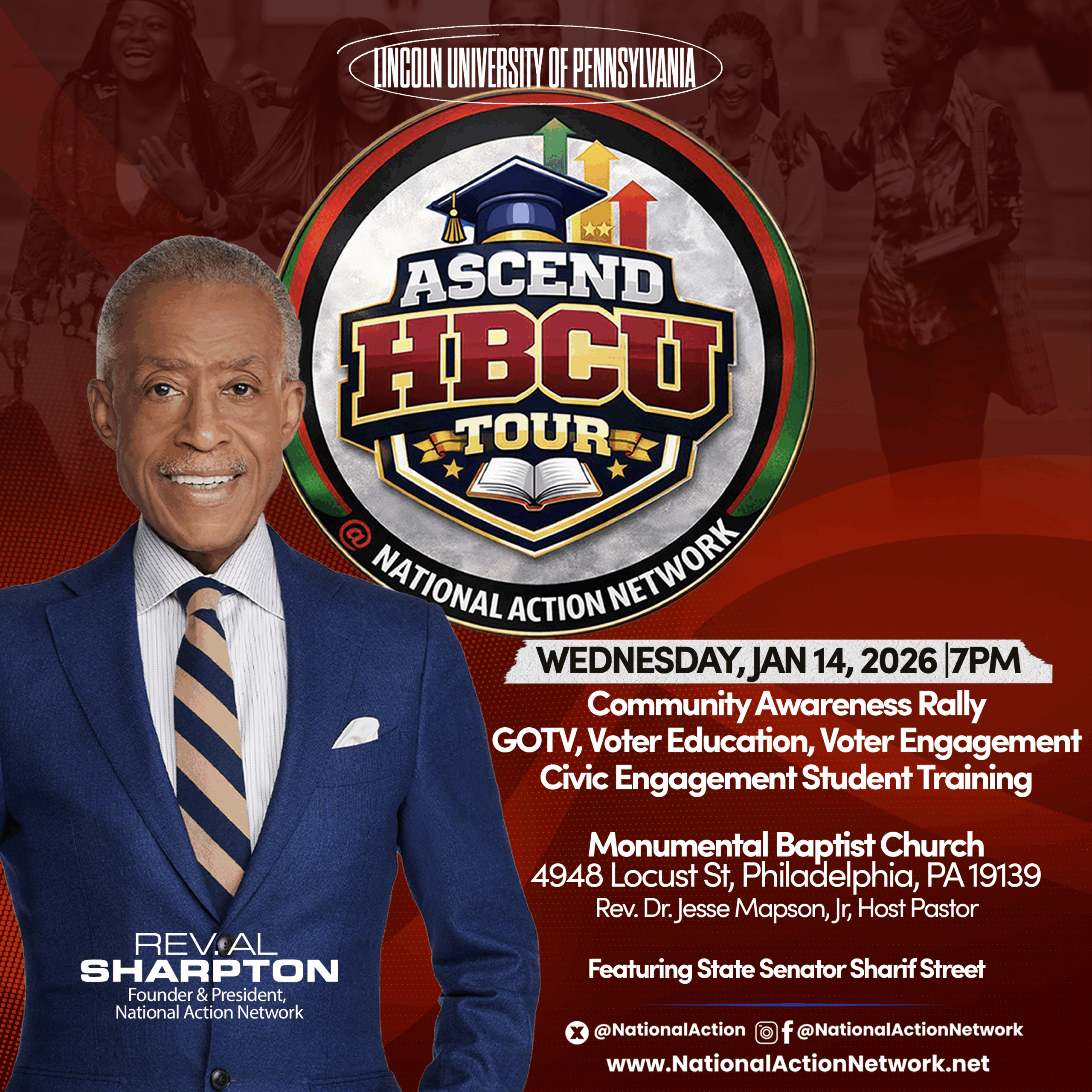 The ASCEND HBCU Tour, presented by the National Action Network, brings the power and urgency of the civil rights movement directly to Historically Black Colleges and Universities across the country. With Rev. Al Sharpton appearing at select tour stops, this tour is designed to bring civil rights to your local campus and build the next generation of justice fighters in this defining moment in history educating, activating, and empowering students to rise, organize, and lead now.